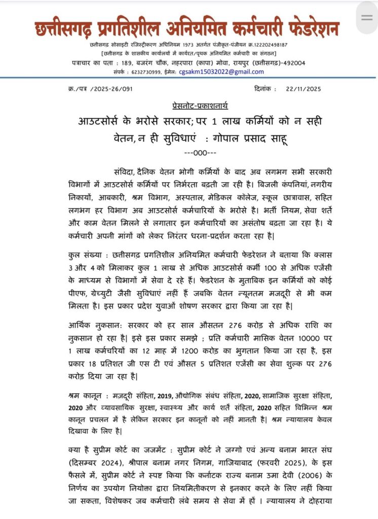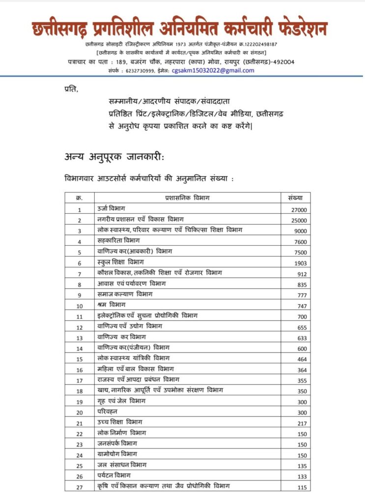 कुल संख्या : छत्तीसगढ़ प्रगतिशील अनियमित कर्मचारी फेडरेशन ने बताया कि क्लास 3 और 4 को मिलाकर कुल 1 लाख से अधिक आउटसोर्स कर्मी 100 से अधिक एजेंसी के माध्यम से विभागों में सेवा दे रहे हैं। फेडरेशन के मुताबिक इन कर्मियों को कोई पीएफ, ग्रेच्युटी जैसी सुविधाएं नहीं हैं जबकि वेतन न्यूनतम मजदूरी से भी कम मिलता है। इस प्रकार प्रदेश युवाओं शोषण सरकार द्वारा किया जा रहा है|