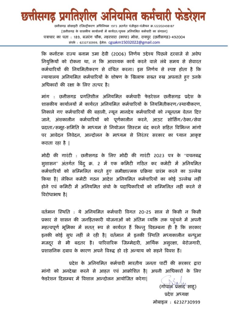 प्रदेश के अनियमित कर्मचारी भारतीय जनता पार्टी की सरकार द्वारा मांगो को अनदेखा करने से आहत एवं आक्रोशित है| अपने आधिकारों के लिए फेडरेशन दिसम्बर में विशाल आन्दोलन आयोजित करेगा|