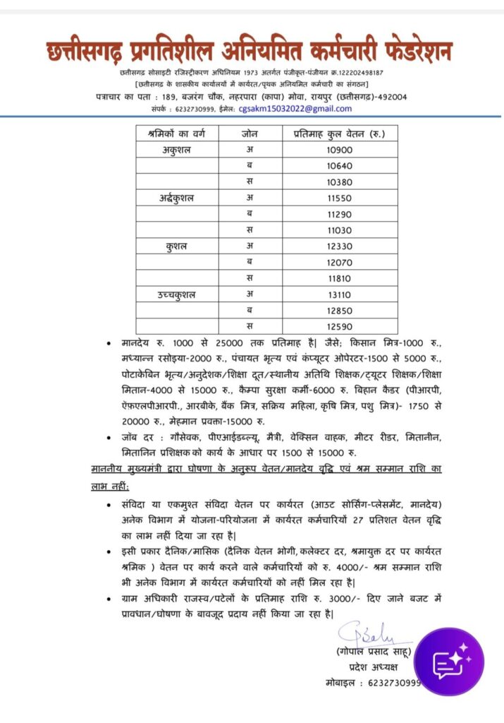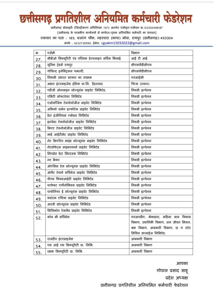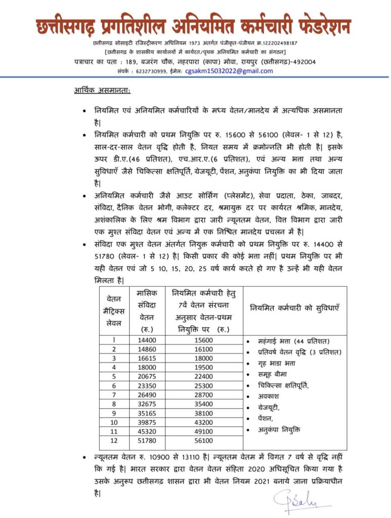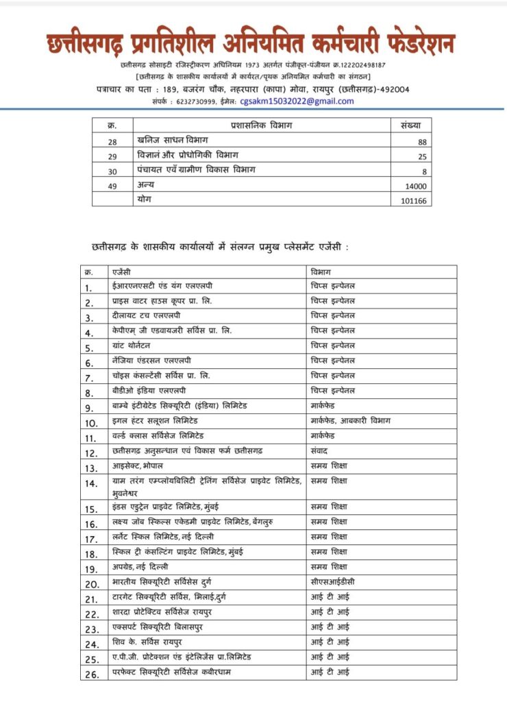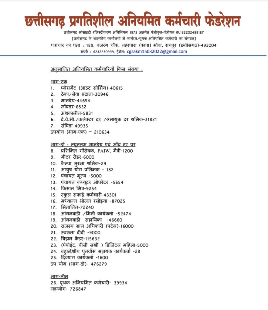 मांग : छत्तीसगढ़ प्रगतिशील अनियमित कर्मचारी फेडरेशन छत्तीसगढ़ प्रदेश के शासकीय कार्यालयों में कार्यरत अनियमित कर्मचारियों के नियमितीकरण/स्थायीकरण, निकाले गए कर्मचारियों की बहाली, न्यून मानदेय कर्मचारियों को न्यूनतम वेतन दिए जाने, अंशकालीन कर्मचारियों को पूर्णकालीन करने, आउट सोर्सिंग/ठेका/सेवा प्रदाता/समूह-समिति के माध्यम से नियोजन सिस्टम बंद करने सहित विभिन्न मांगो पर आवेदन निवेदन, आन्दोलन के माध्यम से निरंतर सरकार का ध्यान आकृष्ट कराता रहा है |