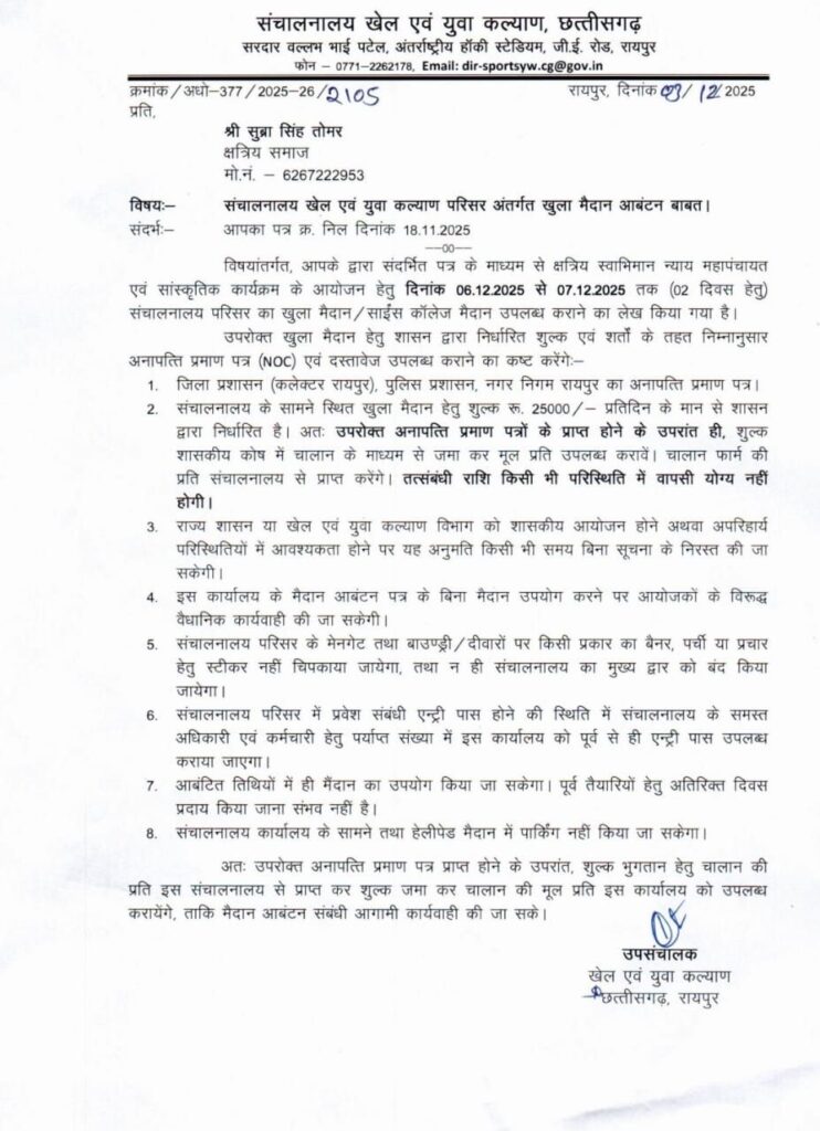 रायपुर। 7 दिसंबर, रविवार को राजधानी रायपुर के साइंस कॉलेज मैदान में करणी सेना के आह्वान पर विशाल “क्षत्रिय स्वाभिमान न्याय महापंचायत” आयोजित होने जा रही है। पूरे प्रदेश सहित देशभर से करणी सेना के कार्यकर्ताओं व क्षत्रिय समाज के प्रतिनिधियों के पहुँचने की संभावना जताई जा रही है। आयोजन को लेकर सोशल मीडिया और समाजिक संगठनों में व्यापक चर्चा है और इसे क्षत्रिय गौरव व स्वाभिमान की निर्णायक लड़ाई बताया जा रहा है।