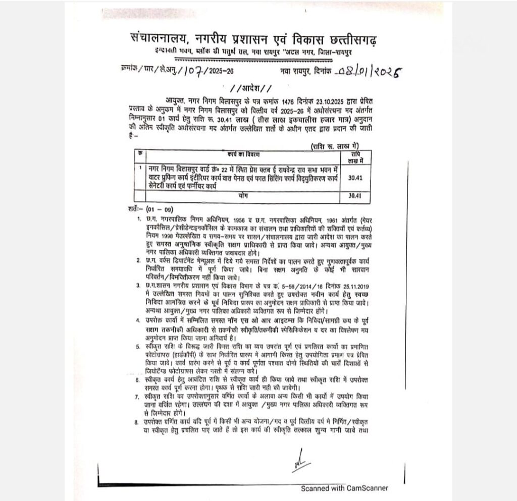 रायपुर/बिलासपुर। बिलासपुर के पत्रकारों की लंबे समय से चली आ रही मांग अब पूरी हो गई है। राज्य सरकार के नगरीय प्रशासन विभाग ने प्रेस क्लब भवन के जीर्णोद्धार और सजावट के लिए 30.41 लाख रुपए की अंतिम मंजूरी दे दी है। उपमुख्यमंत्री अरुण साव से प्रेस क्लब के नए पदाधिकारियों की मुलाकात के महज कुछ ही दिनों के भीतर यह आदेश जारी कर दिया गया। इस राशि से ई राघवेन्द्र राव सभा भवन स्थित प्रेस क्लब में वाटर प्रूफिंग से लेकर शानदार फर्नीचर और बिजली का नया काम कराया जाएगा।