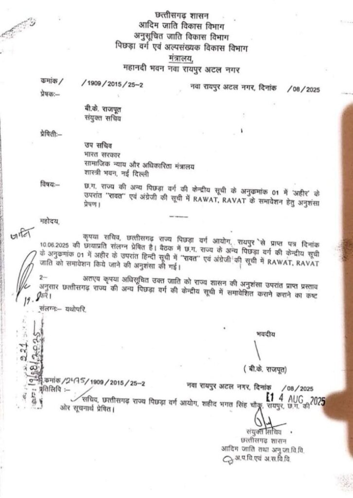बिलासपुर। यादव समाज छत्तीसगढ़ के विभिन्न जिलों के प्रमुख पदाधिकारीगण कुछ माह पूर्व पिछड़ा वर्ग आयोग छत्तीसगढ़ शासन के पूर्व अध्यक्ष तथा छत्तीसगढ़ यादव समाज के संरक्षक डॉ सोमनाथ यादव के नेतृत्व में मुख्यमंत्री श्री विष्णु देव साय से रायपुर में मिले थे जहां छत्तीसगढ़ के 30 लाख से निवासरत यादव समाज की अनेक मांगों को लेकर एक मांग पत्र सौंपा गया था जिसमें रावत (ravat) उपजाति को भारत सरकार की पिछड़ा वर्ग केंद्रीय सूची के क्रमांक एक में अहीर के बाद रावत को शामिल करने की मांग की थी जिसे छत्तीसगढ़ राज्य शासन के संयुक्त सचिव ने भारत सरकार सामाजिक न्याय और अधिकारिता मंत्रालय नई दिल्ली को “रावत” को केंद्रीय सूची में अहीर के बाद समावेशन हेतु पत्र प्रेषित किया है। रावत को केंद्रीय सूची में शामिल होने पर बिलासपुर जिला यादव समाज के पदाधिकारीगण सर्वश्री शिवशंकर यादव, नीरज यादव , अमित यादव, अनिल यादव, जितेंद्र यादव, गोपाल यादव, संजय यादव, शंकर यादव, सतीश यादव, शिव यादव, संतोष यादव, विकाश यादव, प्रकाश यादव, बाला यादव, प्रमोद यादव, विकास यादव, कमल यादव, गोपाल यादव, सुरेश यादव, राजकुमार यादव, रामकुमार यादव, मनोज यादव, दिलीप यादव, अजय यादव, कैलाश यादव, कृष्ण कुमार यादव आदि ने प्रसन्नता व्यक्त कर राज्य सरकार का आभार व्यक्त किया।