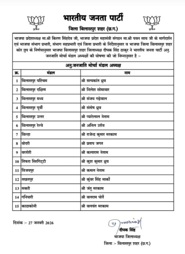 बिलासपुर — भाजपा प्रदेशाध्यक्ष मा.श्री किरण सिंहदेव जी, भाजपा प्रदेश महामंत्री संगठन मा.श्री पवन साय जी के मार्गदर्शन एवं भाजपा संभाग प्रभारी, संभाग सहप्रभारी एवं जिला प्रभारी के निर्देशानुसार व भाजपा जिला बिलासपुर शहर कोर ग्रुप के निर्णयानुसार भाजपा बिलासपुर शहर जिलाध्यक्ष दीपक सिंह ठाकुर ने भारतीय जनता पार्टी अनु.जनजाति मोर्चा मंडल अध्यक्षों की घोशणा की जो निम्नानुसार है :-