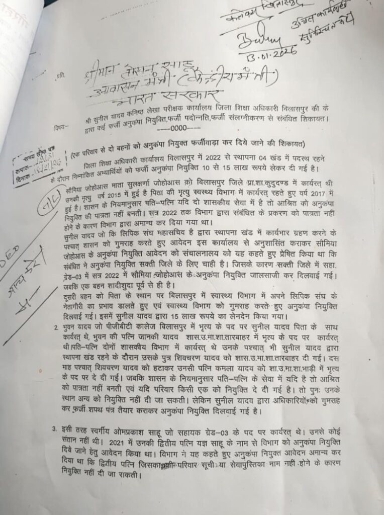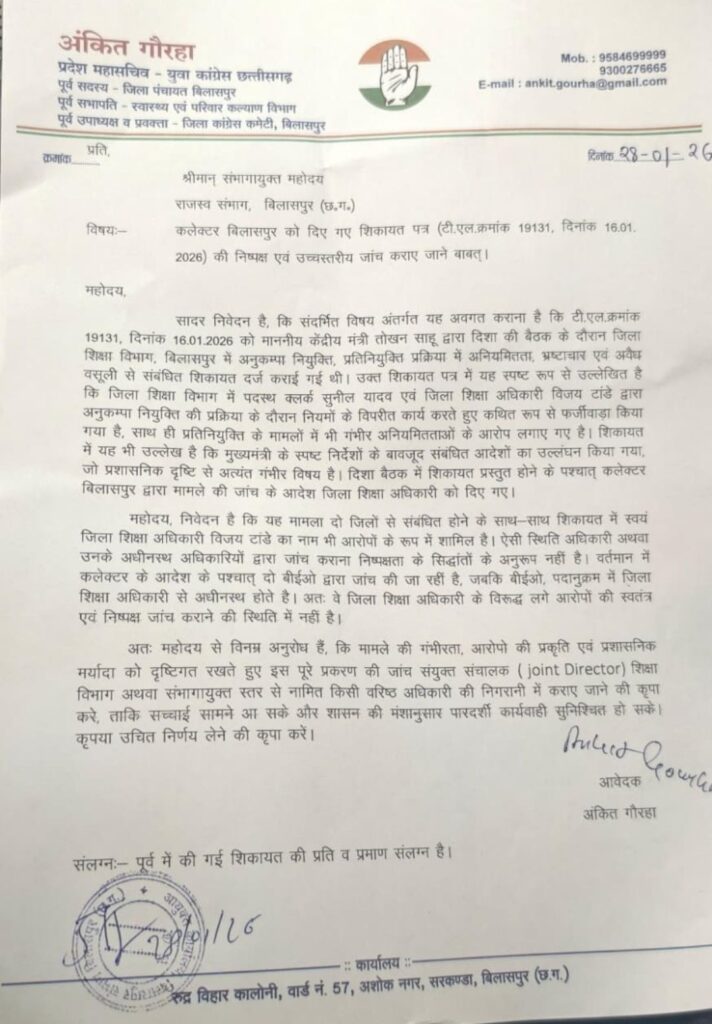 बिलासपुर…शिक्षा विभाग में अनुकंपा नियुक्ति के नाम पर चल रहे कथित खेल ने प्रशासनिक ईमानदारी पर गंभीर सवाल खड़े कर दिए हैं। कांग्रेस नेता अंकित गौराहा ने पूरे मामले को “संगठित भ्रष्टाचार” करार देते हुए कमिश्नर को लिखित शिकायत सौंपी है और साफ कहा है कि यदि जांच ज्वाइंट डायरेक्टर शिक्षा या कमिश्नर स्तर पर नहीं हुई, तो मामला डीपी और सचिव स्तर तक ले जाया जाएगा। जरूरत पड़ी तो आंदोलन और धरना भी होगा।