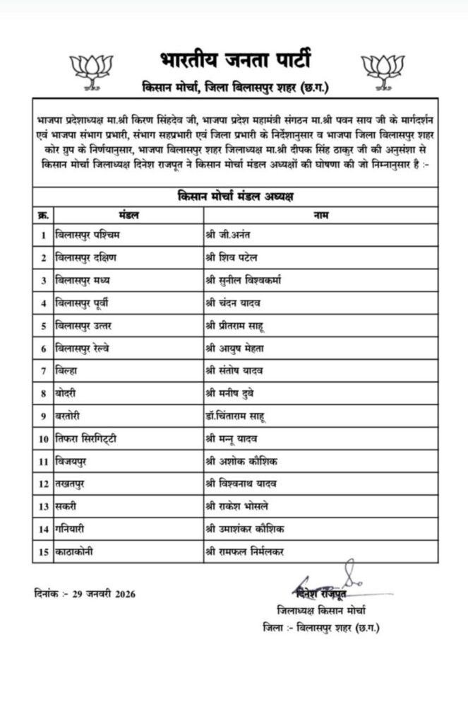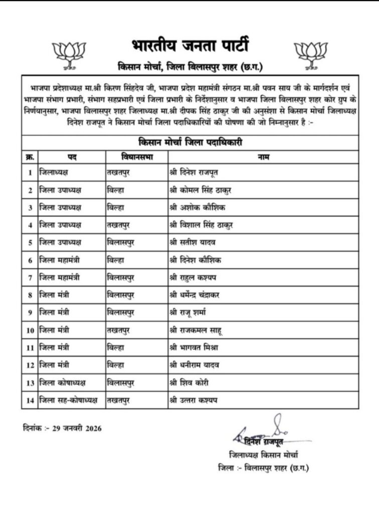 बिलासपुर–भारतीय जनता पार्टी किसान मोर्चा जिला बिलासपुर शहर में संगठन को और अधिक सशक्त बनाने के उद्देश्य से जिला एवं मंडल स्तर पर पदाधिकारियों की जम्बो टीम की घोषणा की गई है। यह सूची भाजपा किसान मोर्चा जिला अध्यक्ष श्री दिनेश राजपूत द्वारा जारी की गई।