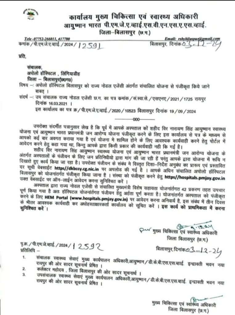बिलासपुर/बेलतरा — बेलतरा विधानसभा क्षेत्र में आयुष्मान भारत–प्रधानमंत्री जन आरोग्य योजना को लेकर किए गए बड़े-बड़े दावे अब सिर्फ कागज़ों तक सिमटकर रह गए हैं। बेलतरा विधायक द्वारा सार्वजनिक मंच से यह कहा गया था कि “या तो अपोलो हॉस्पिटल आयुष्मान कार्ड के तहत गरीबों का इलाज शुरू करे, या फिर शासकीय जमीन खाली करे”, लेकिन ज़मीनी सच्चाई इससे बिल्कुल उलट नजर आ रही है।हकीकत यह है कि अपोलो हॉस्पिटल में आज तक आयुष्मान कार्ड से गरीबों का इलाज शुरू नहीं हुआ। जिला बिलासपुर के मुख्य चिकित्सा एवं स्वास्थ्य अधिकारी द्वारा जारी आधिकारिक पत्र से यह साफ हो जाता है कि अपोलो हॉस्पिटल ने आयुष्मान भारत एवं शहीद वीर नारायण सिंह आयुष्मान स्वास्थ्य योजना में पंजीकरण के लिए आवश्यक आवेदन तक नहीं किया। जबकि अस्पताल को इस संबंध में कई बार निर्देशित और अवगत कराया गया था। इसके बावजूद अब तक कोई ठोस कार्रवाई क्यों नहीं हुई,यह सवाल गंभीर संदेह को जन्म देता है।