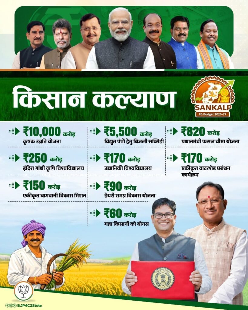 छत्तीसगढ़ के बजट 2026-27 में किसानों के लिए किए गए बड़े प्रावधानों का स्वागत करते हुए बी.पी. सिंह, प्रदेश प्रवक्ता किसान मोर्चा ने इसे किसान हित में ऐतिहासिक और दूरदर्शी बजट बताया है। उन्होंने कहा कि यह बजट स्पष्ट रूप से दर्शाता है कि छत्तीसगढ़ किसानों का प्रदेश है और सरकार की प्राथमिकता खेती-किसानी है