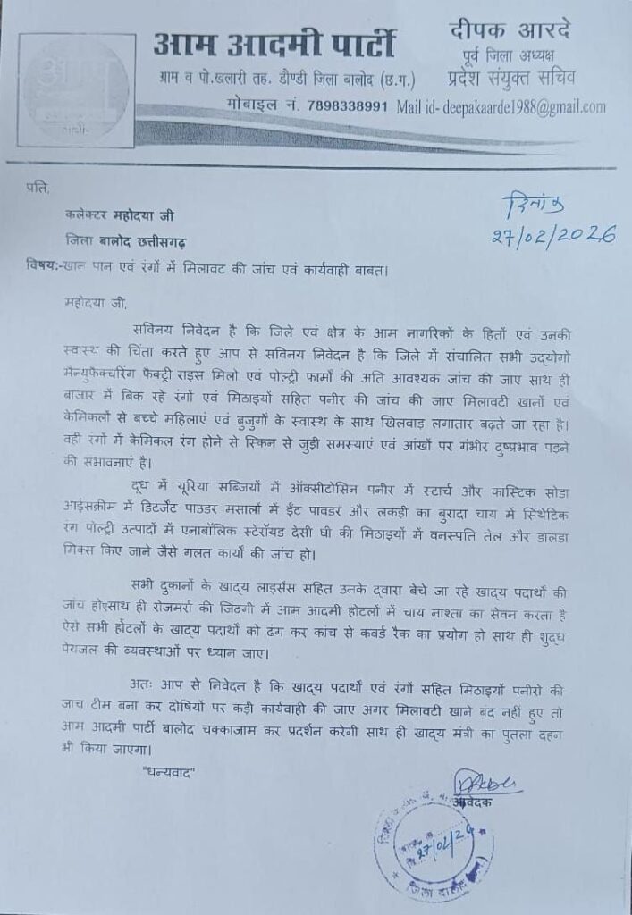 इसी मामले को लेकर आम आदमी पार्टी बालोद द्वारा भी ज्ञापन सौंपा गया,जिसमें मांग की गई कि खाद्य पदार्थों की जांच हो,मैन्युफैक्चरर फैक्ट्री,राइस मिल,बड़े स्टोर्स सहित सभी जगह खाद्य पदार्थों से मिलावट से जुड़े मामलों पर त्वरित कार्यवाही हो और आम जनता के साथ स्वास्थ के साथ खिलवाड़ न हो।
