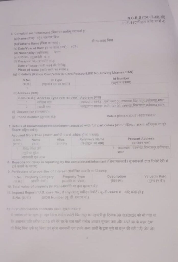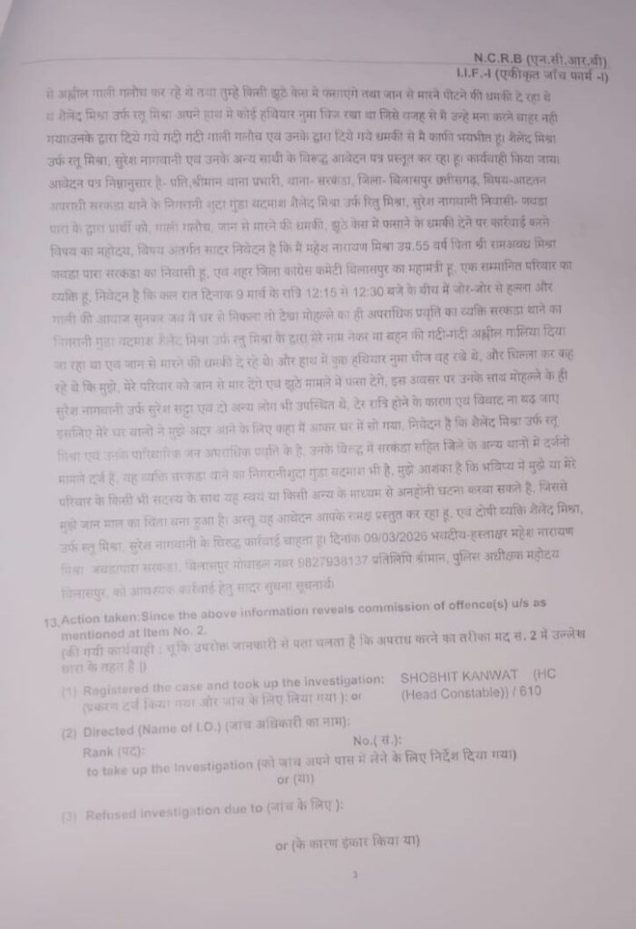 कि दिनांक 8 मार्च को रात लगभग 12:15 बजे सरकंडा थाने के निगरानीशुदा गुंडा बदमाश एवं कई आपराधिक मामलों में सम्मिलित शैलेंद्र मिश्रा उर्फ रतु एवं सरकंडा निवासी सुरेश नागवानी उर्फ सुरेश सट्टा द्वारा कांग्रेस नेता के घर के बाहर अश्लील शब्दों से गाली गलौच करने एवं जान से मारने की धमकी दिया जा रहा था, बात ना बड़े इसलिए कांग्रेस नेता ने कुछ नहीं किया, आज 9 मार्च को कांग्रेस नेता श्री महेश मिश्रा ने प्रमाण सहित पुलिस अधीक्षक से शिकायत किया जिस पर पुलिस अधीक्षक के निर्देश पर थाना सरकंडा के द्वारा आपराधिक तत्व शैलेंद्र मिश्रा उर्फ रतू एवं सुरेश नागवानी, उर्फ सुरेश सट्टा के विरुद्ध भारतीय न्याय संहिता BNS की धारा 296, 351( 3) और 3(5) के तहत अपराध दर्ज कर कार्रवाई की जा रही है, विदित हो की रतु मिश्रा के विरुद्ध कई थानों में दर्जनों मामले दर्ज हैं, एवं रितु मिश्रा थाना सरकंडा का निगरानीशुदा गुंडा बदमाश भी है, पूर्व में थाना सरकंडा के द्वारा उनके विरुद्ध जिला बदर की कार्रवाई हेतु भी अनुशंसा किया गया है ll