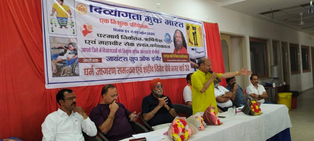 बिलासपुर। “दिव्यांगता मुक्त भारत” के संकल्प के साथ धर्म जागरण समन्वय एवं शहीद विनोद चौबे नगर वार्ड 32 के संयुक्त तत्वावधान में आयोजित निःशुल्क कृत्रिम अंग (हाथ एवं पैर) प्रत्यारोपण शिविर का चौथा दिवस अत्यंत सफलतापूर्वक सम्पन्न हुआ। यह सेवा परियोजना 01 से 05 अप्रैल 2026 तक आयोजित की जा रही है, जिसमें परमार्थ निकेतन, ऋषिकेश एवं महावीर सेवा सदन, कोलकाता के सहयोग से तकनीकी मार्गदर्शन में दिव्यांगजनों को निःशुल्क कृत्रिम अंग प्रदान किए जा रहे हैं।